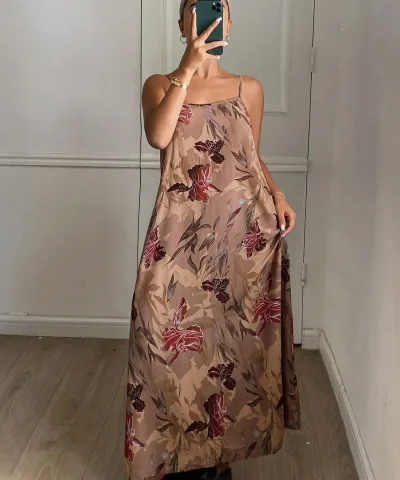 Satin Maxi Slip Dress – Vintage Brown Floral