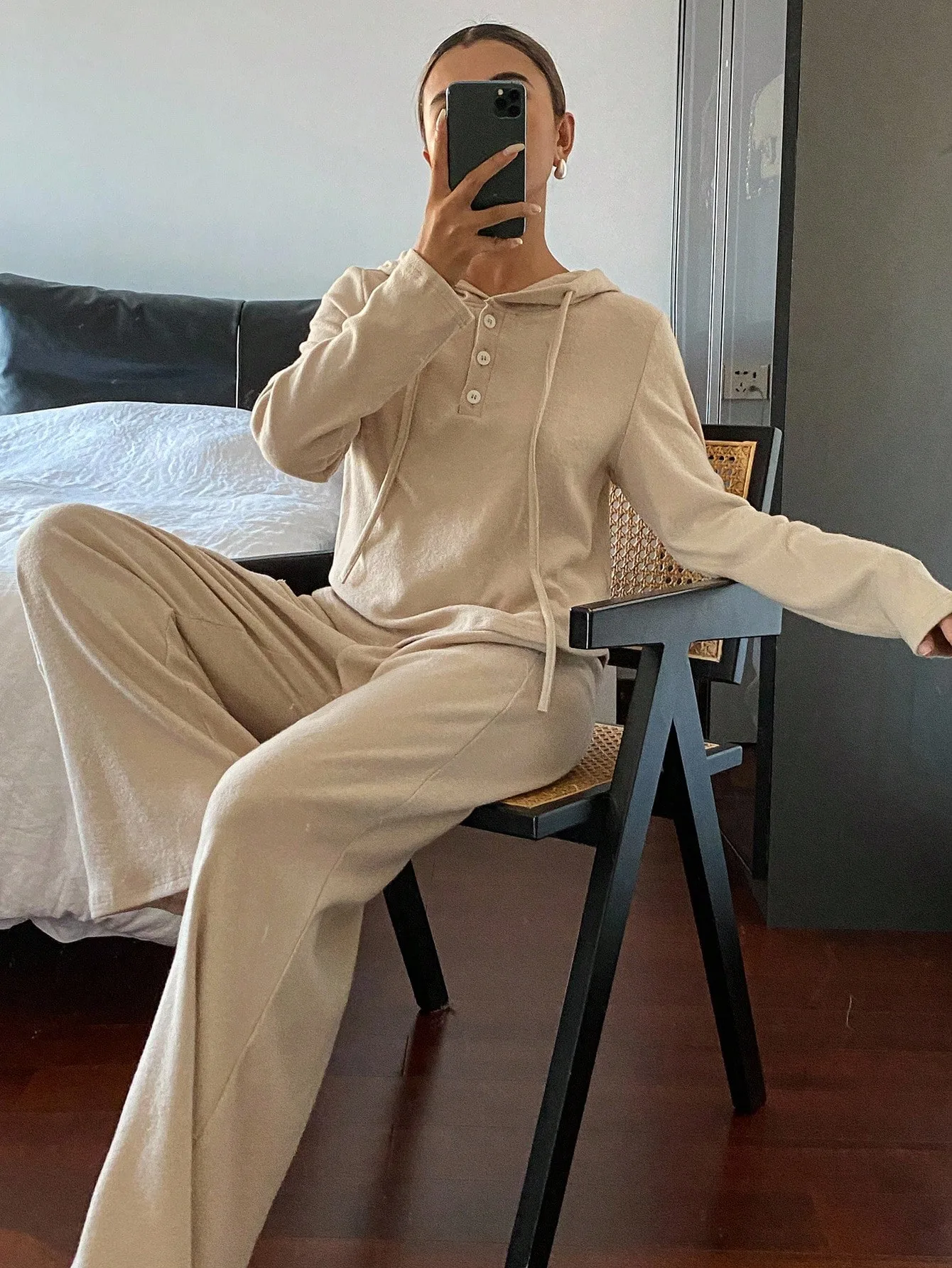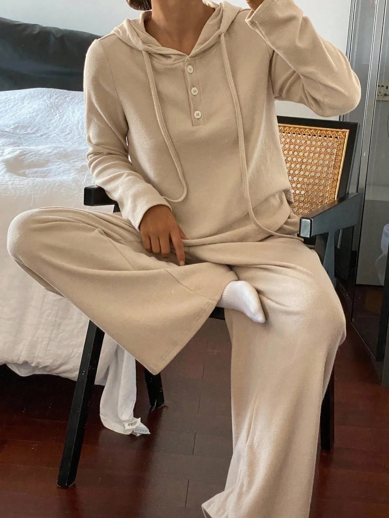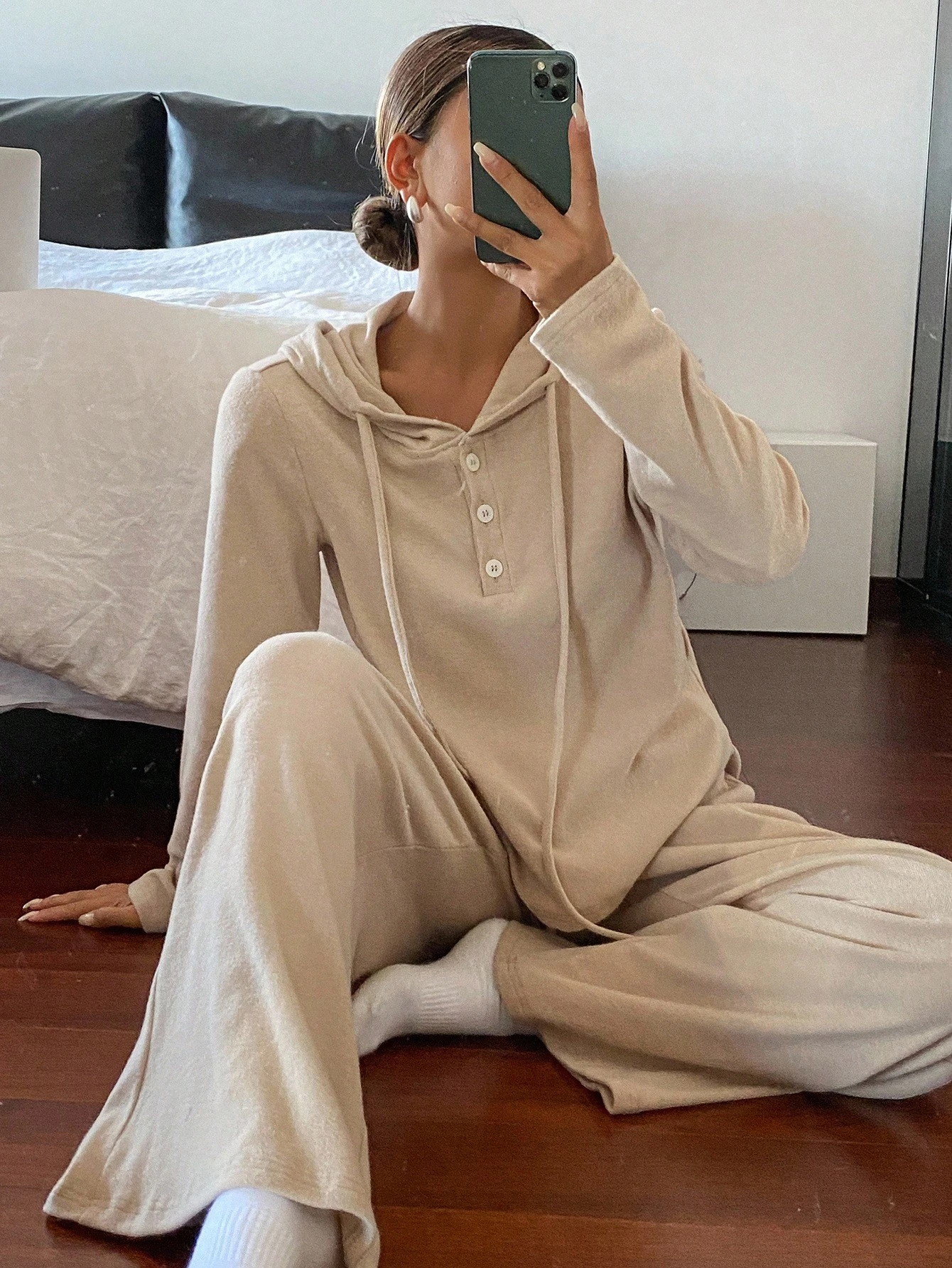 - Style: Two-piece lounge set (hooded pullover top + wide-leg pants)