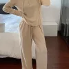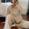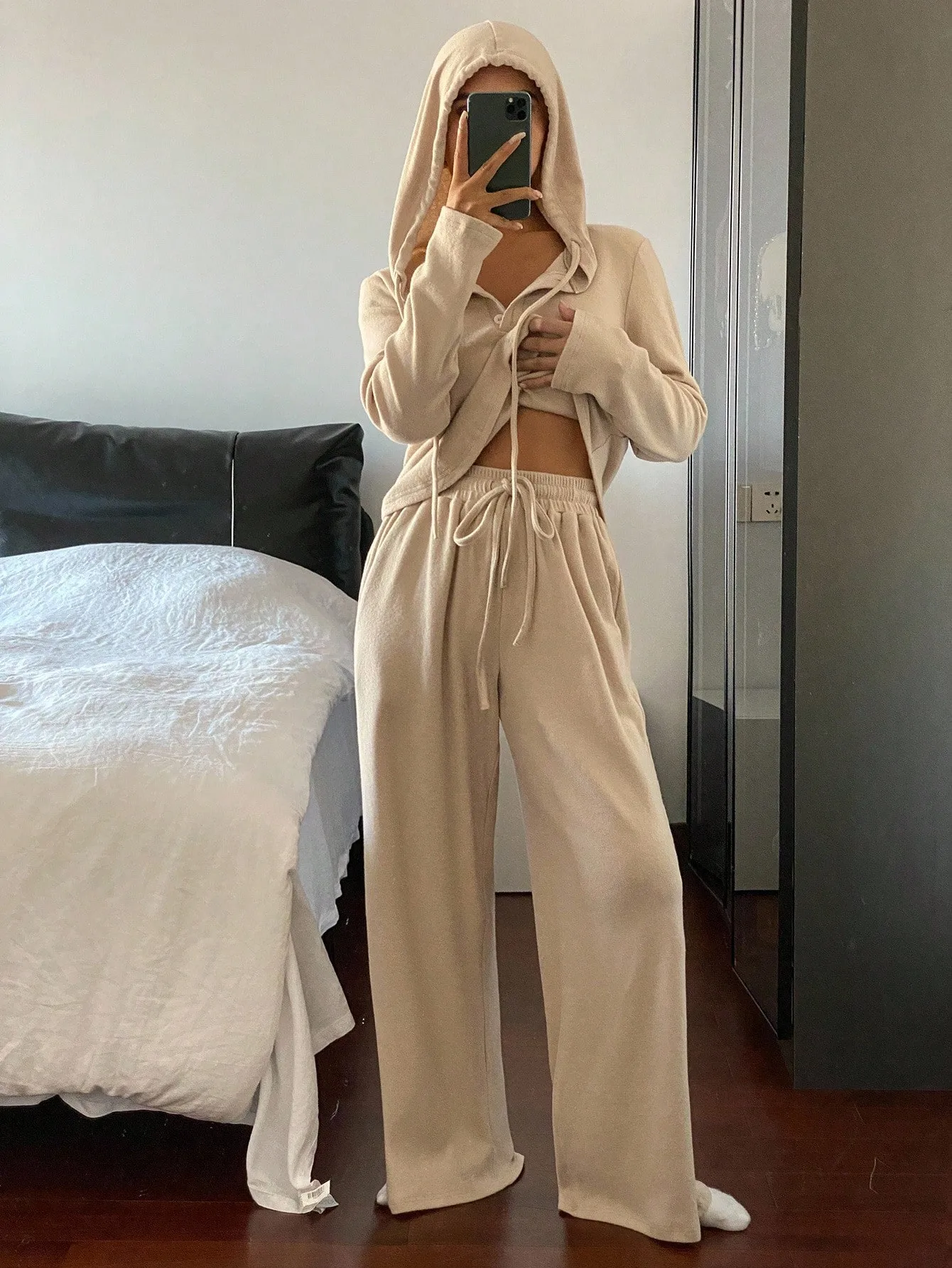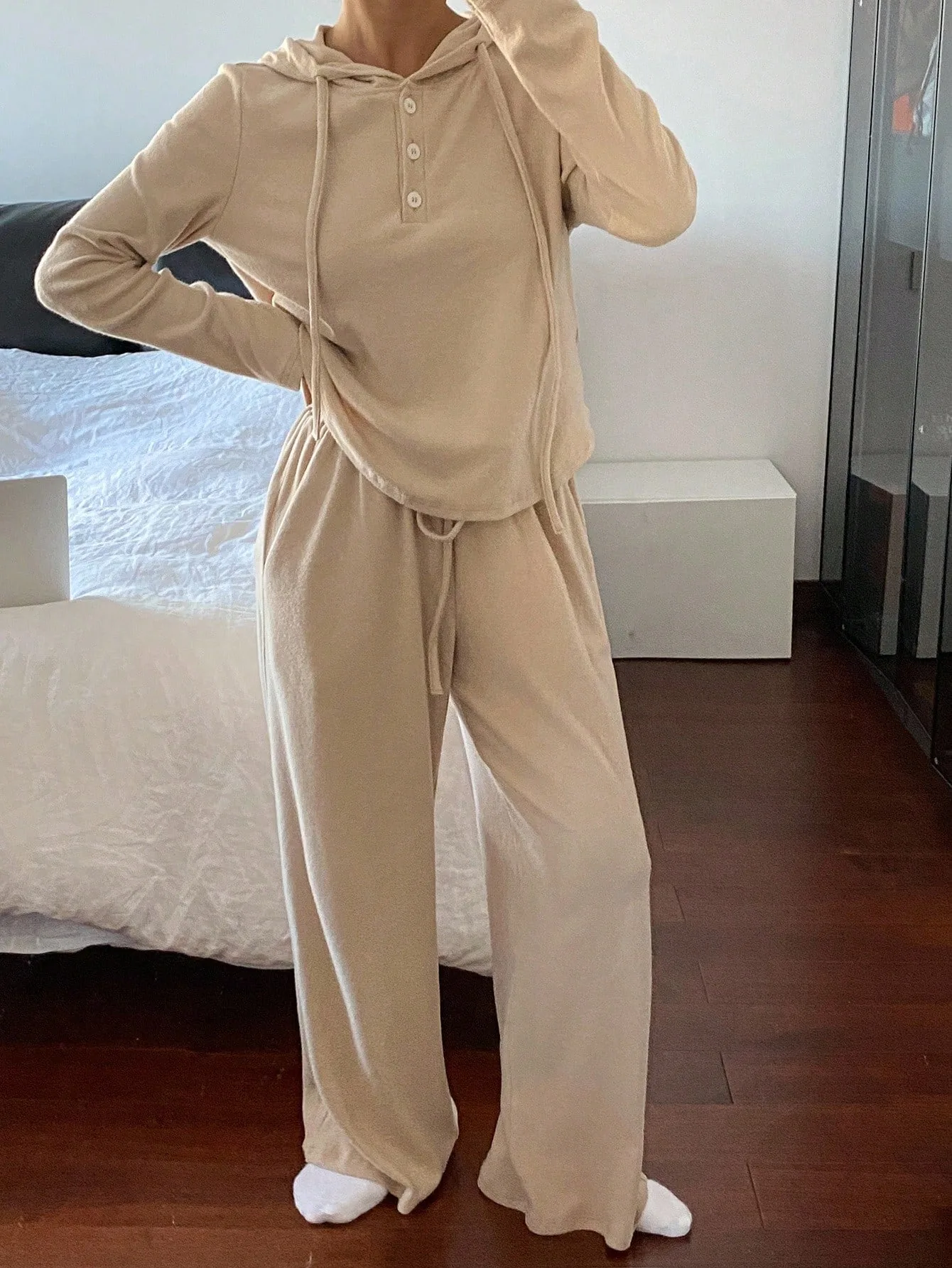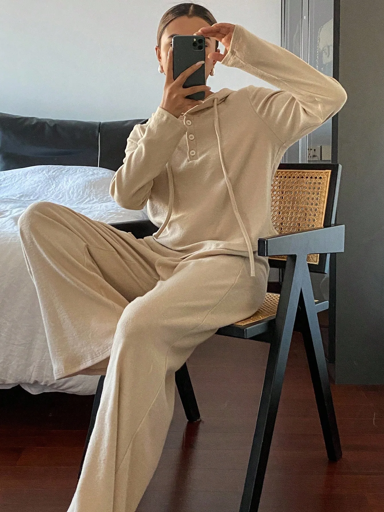 - Style: Two-piece lounge set (hooded pullover top + wide-leg pants)