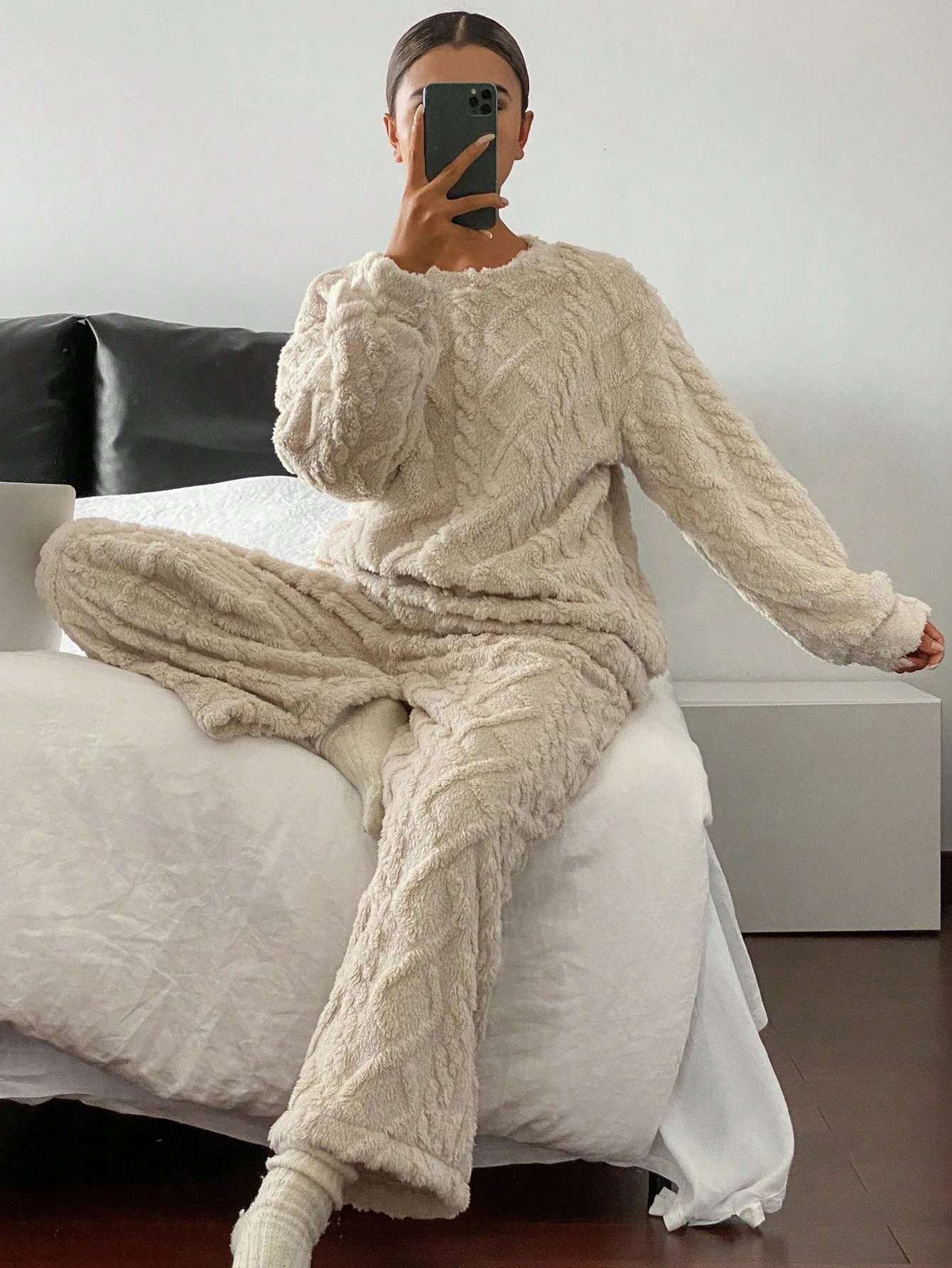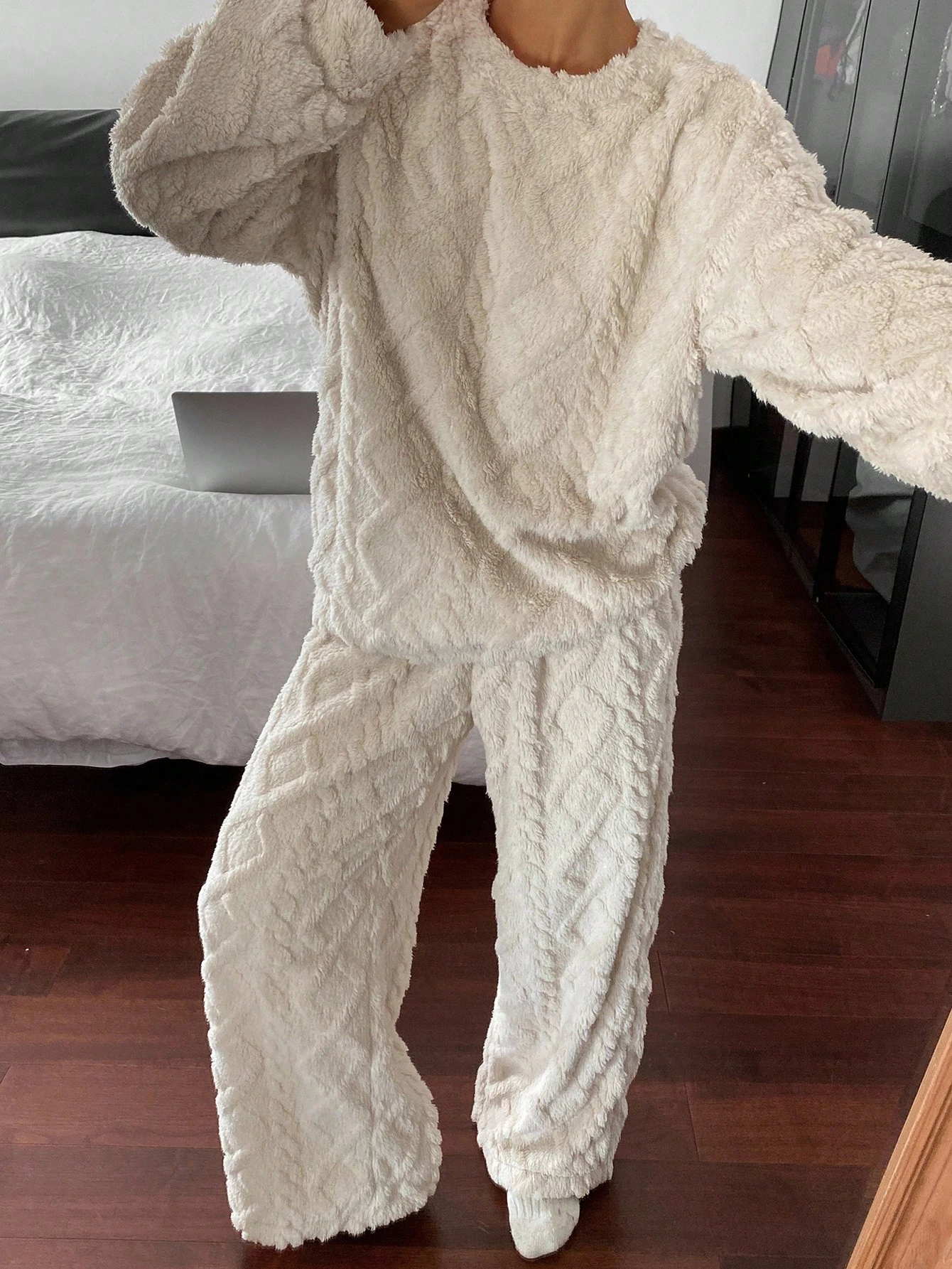 Wrap yourself in warmth and softness with this cream textured fleece lounge set. Featuring a relaxed fit and a unique patterned surface, it’s the perfect blend of comfort and style. Ideal for cozy nights or lazy mornings, this set makes loungewear feel luxurious.